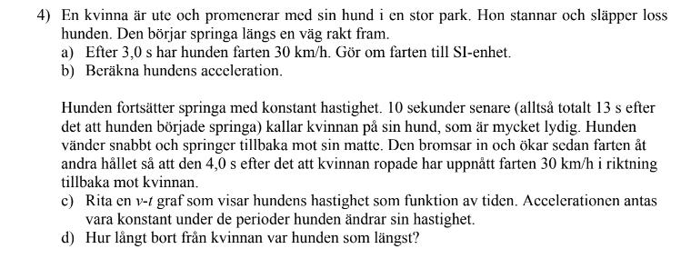 Man vet ju att på 3 sekunder har hunden farten 8,3 m/s sen håller den det i 10 sek och sedan bromsar han hur ska jag veta hur lång tid bromsning tar eftersom det är det jag behöver i uppgift d.