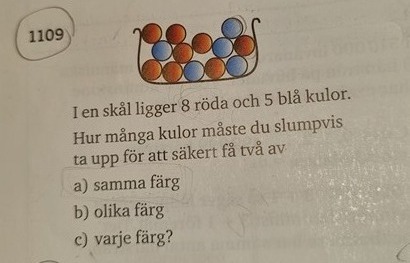 Hur blir svaret på b), nio kulor? Det borde ju vara 6 kulor då man kan få 5 blå kulor i rad och då säkert får en röd.