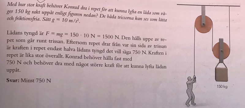 Eftersom repet drar från var sin sida av trissan är kraften i repet endast halva lådans tyngd, det vill säga 750 N.