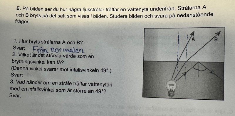 Blir svaret på fråga 2: 48 grader då? För När brytningsvinkeln blir över 48 grader blri brytningsvinklen lika stor som infallsvinkeln och då blir det ingen brytning.
