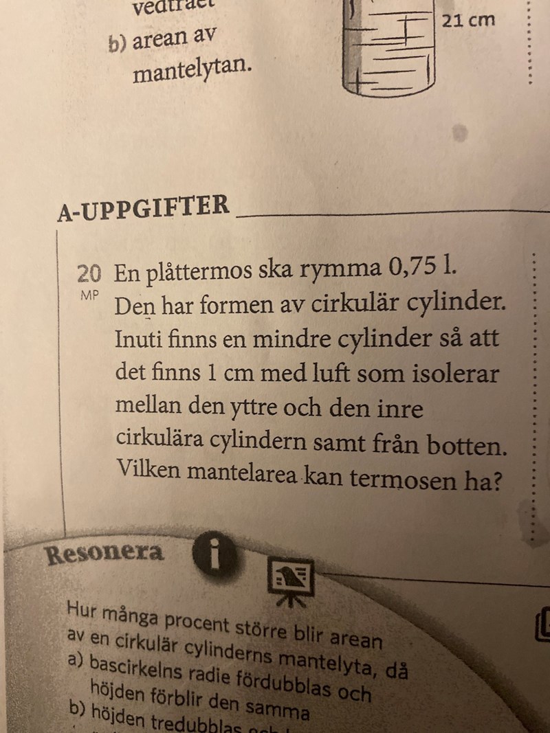 Börja med att ta fram ett förslag på vilka dimensioner (radie och höjd) den inre cylindern kan ha.