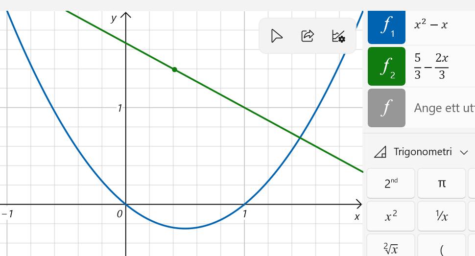 Förstår inte riktigt på vilen punkt av kurvan, dvs en blåa, är tangenten, den gröna, parallell med räta linjen?