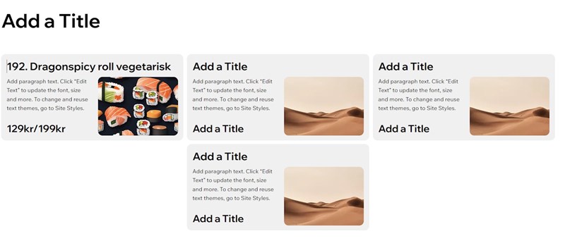 Jag håller på att designa en hemsida åt en restaurang och tänkte visa upp deras rätter i form av kort, liknande vad Foodora och Wolt har. Vad tycker ni om denna design? Vad kan förbättras?