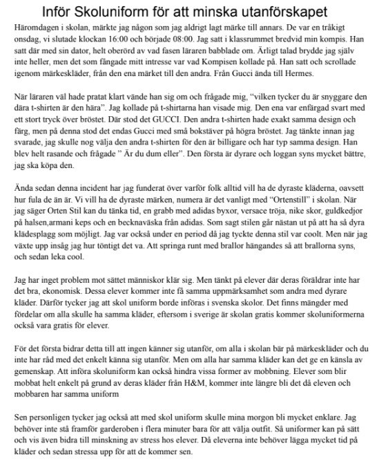 Sedan behöver du korrekturläsa din text. Det finns några språkliga fel här och var, exempelvis är skoluniform ett ord och inte två, och på några ställen har du gjort missar med skiljetecken och stora/små bokstäver. Men det är inget som inte går att rätta till! :)