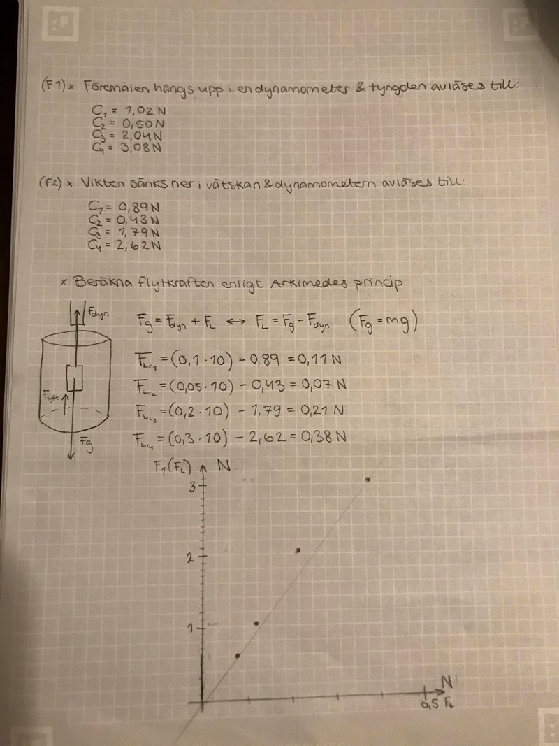 Vilka värden på lyftkraft, tyngdfaktor och volym har du använt ( och ange respektive SI enhet)?