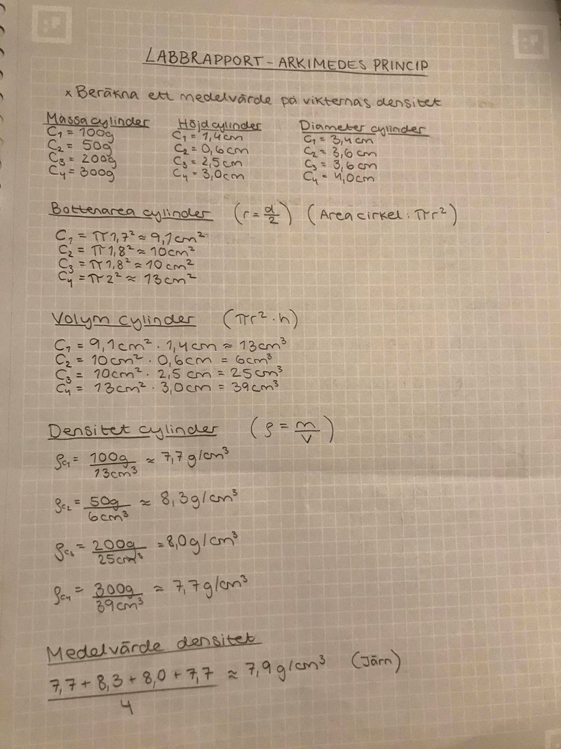 Svaret blir cirka 0.96 kg/m3. Det skulle vara ett logiskt svar om det var i g/cm3. Alla siffror jag räknat med är rätt och jag har gjort om dem till SI-enheter därav blev svaret i kg/m3. Men siffran är ju bara logisk om det hade varit g/cm3. Vad kan ha gått fel?