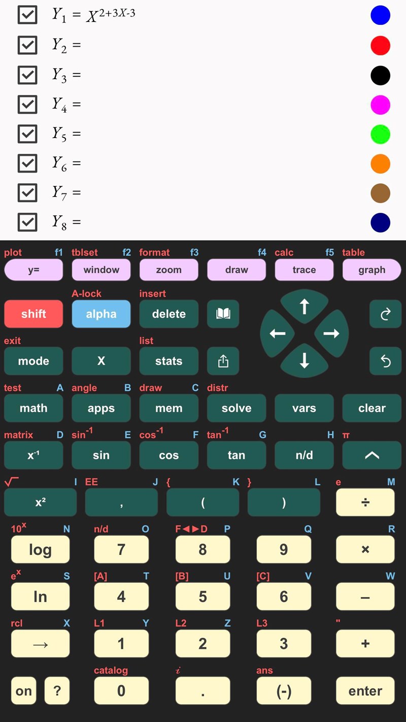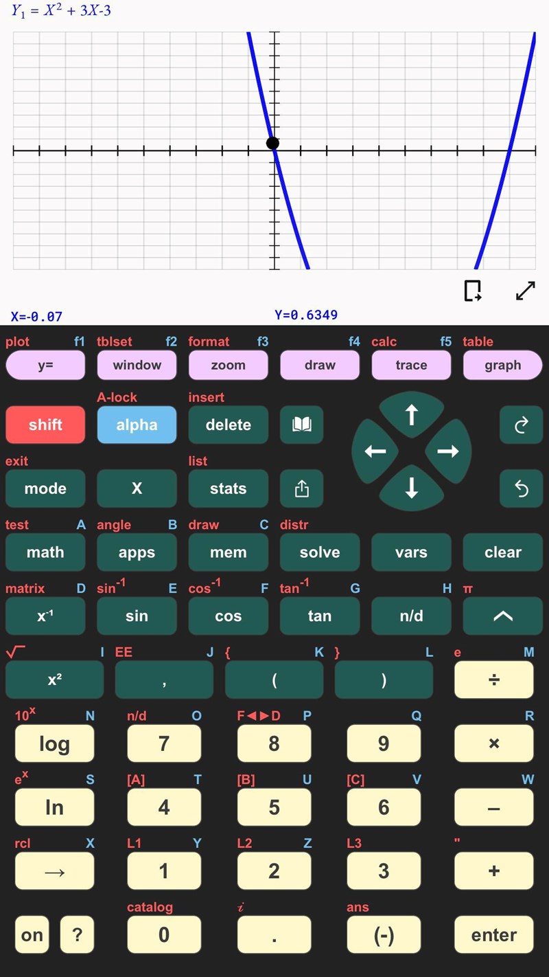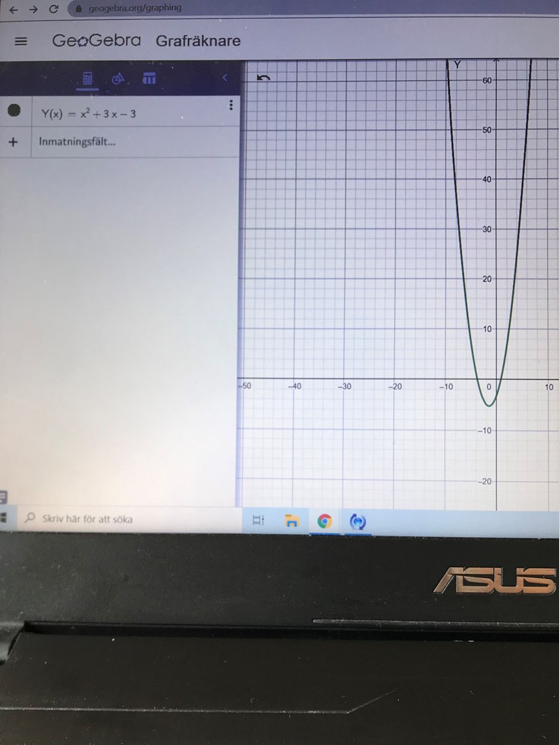rita grafen Y=X^2+3x -3. Men får inte rätt graf när jag skriver in den utan ser ut som på bilderna nere, har testat med både - och (-) knappen, kan det vara någon inställning som jag inte känner till? För när jag skriver denna graf på geogebra.com så får jag in rätt graf.