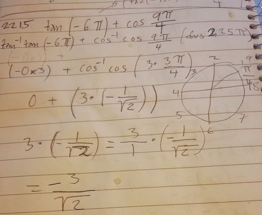 Jag gör på samma sätt med cosinus, som ju var 9pi/4 dvs 2,25 pi. Jag får svaren plus och minus pi/4 // 45 grader.