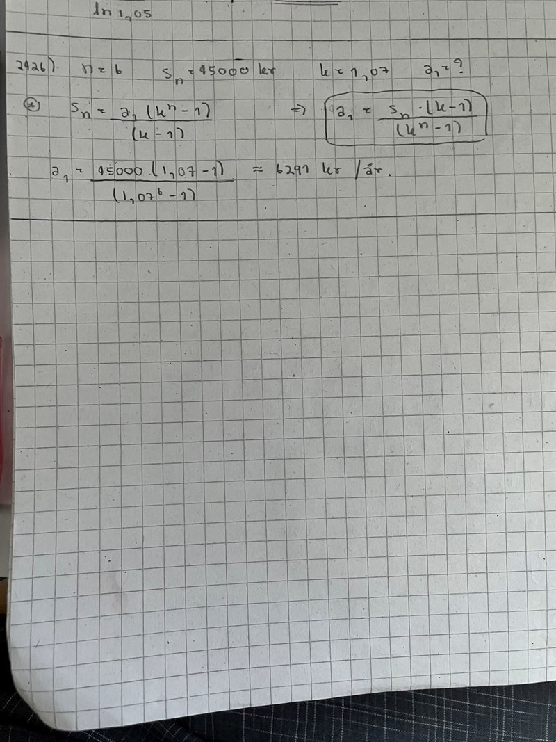 Nisse ska spara ihop 45000 kr på sex år. Varje år sätter han in samma belopp i en fond med avkastningen 7%. Hur stort är detta belop?