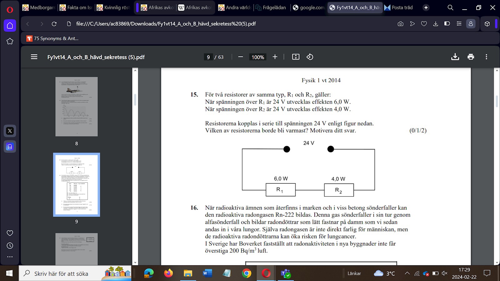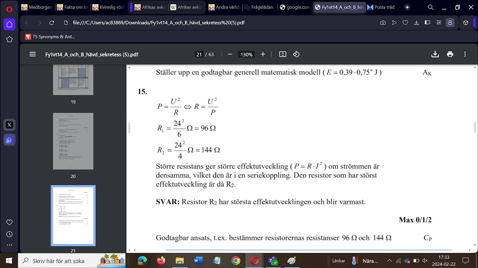 I frågan säger den att resistorerna är kopplade till en spänning med 24 V. Jag har för mig att det betyder Utot = 24 V. Därmed följer             Utot = U+ U2      24 = U1 + U2