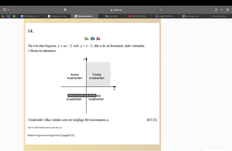 På denna uppgift, kom jag fram till att a = 1 + 1/x genom att göra en ekvation av när de räta linjerna skär varandra. Då kan alla vara överens om att x > 1 då 1/x produkt behöver vara större än 0 då de skär varandra i första kvadranten.