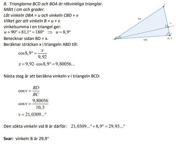 Ser nu att triangeln BDA är "upp och ner". Jag har ju sett 81,1 som den räta vinkeln, vilket är helt korkat, det är ju klart att vinkeln vid D är den räta... UGH..