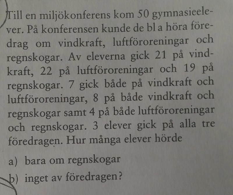 Facit har rätt. Har du ritat ett Venn-diagram? Det var 8 elever som gick på både vindkraft och regnskogar. Tre av dem gick även på föredraget om luftföroreningar. Det var 4 elever som gick både på luftföroreningar och regnskogar. Tre av dem gick även på föredraget om vindkraft. Du har räknat dessa tre elever tre gånger.