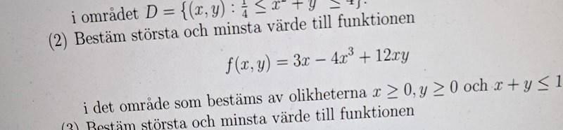 Smaragdalena skrev:Undersök de punkter som ligger i triangeln (inklusive randpukterna). Det räcker att undersöka tre fall: