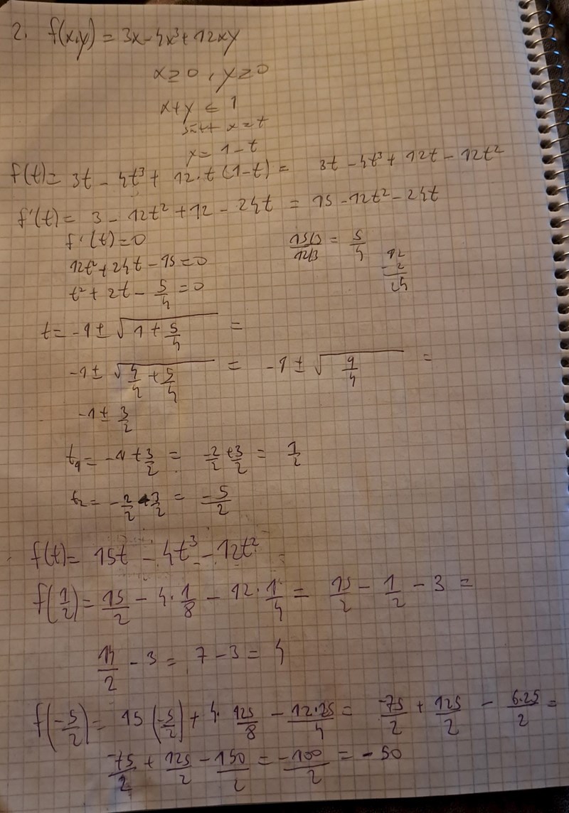 Det är punkterna (0,0),(0,1) och (1,0) som bildar området D. Det måste innebära att t=-5/2 ligger ej i området D och då kan vi titta på randpunkterna istället om de kan ge upphov till minsta och största värde. Vi ser att (1,0) funkar alldeeles utmärkt då vi får att minsta värde blir -1. Dock har jag lite svårt att förstå varför t=-5/2 ej kan godkännas för när man sätter in den i parametriseringen så stämmer olikheten x+y större eller lika med 1 men ej för x större eller lika med 0 ty x är negativt.