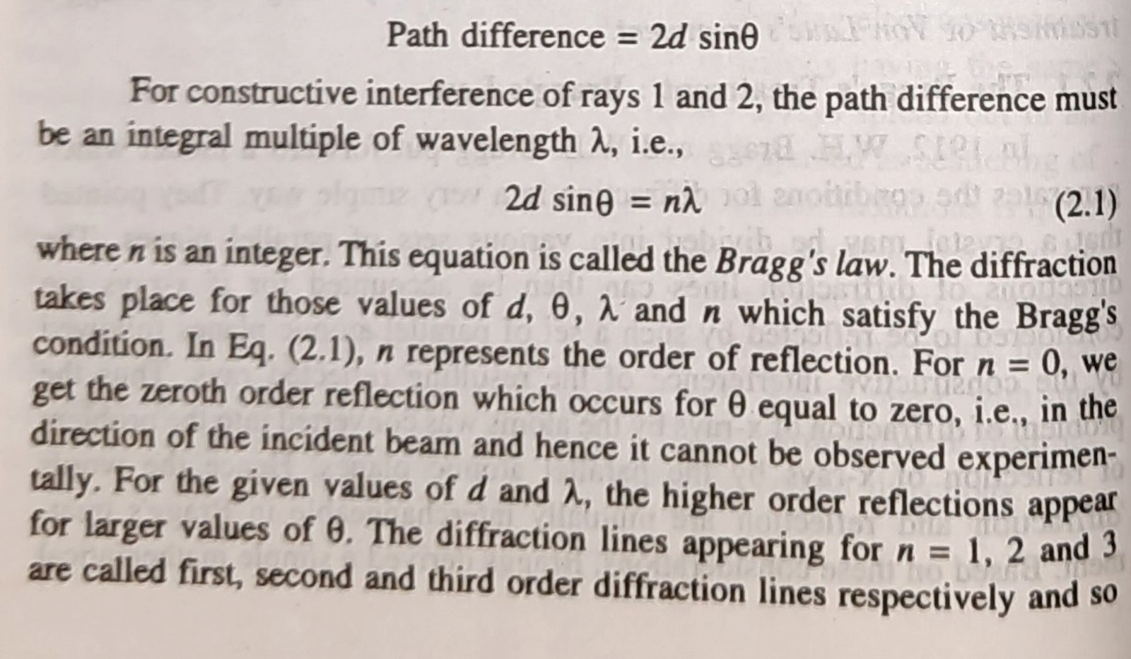 Dessutom brukar även högre ordningar behandlas med n=1 i röntgendiffraktion. Istället räknar man med planavstånd d som är halvt så stora, eller en tredjedel, osv.