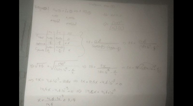 I en jämviktsblandning är koncentrationen av vätgas 0,092 mol/dm3 och koncentrationen jod 0,0020 mol/dm3. Beräkna koncentrationen av vätejodid.