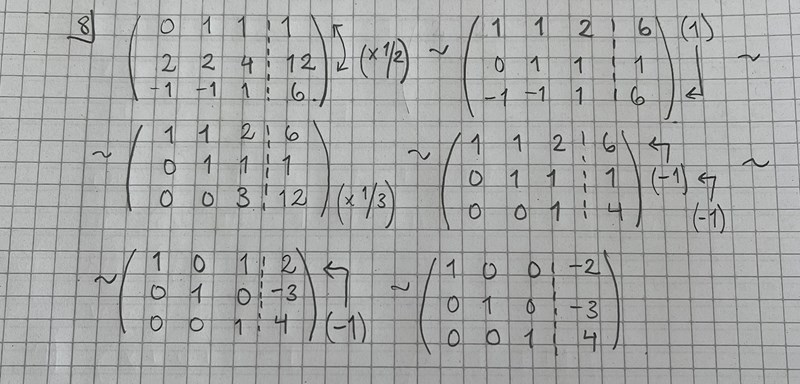 Jag Gaussar och får y och z till rätt svar, men vid sista raden av min uträkning nedan så får jag x=-2, när facit och verifiering säger att x=1. Varför blir det fel när jag gör som jag gör? Varför kan man inte göra så?