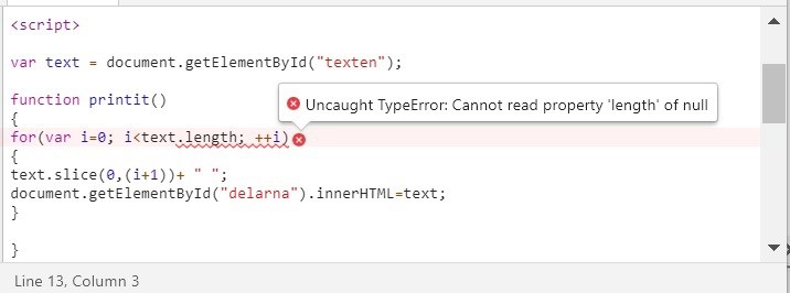Tittade inte efter det felet eftersom du inte skrev något om att du hade ett sånt fel. Åtgärdas genom att flytta variabeldeklarationen av text in i funktionen printit(). Jag döpte om variabeln till inputText. Har lagt till en variabel outputText som byggs upp av varje slice() med en radbrytning efter varje. Funkar.