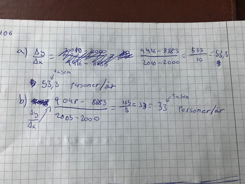 På fråga b så fick jag fram att svaret skulle vara 33 000 personer per år, men det står 73 600. Vad har jag gjort för fel?