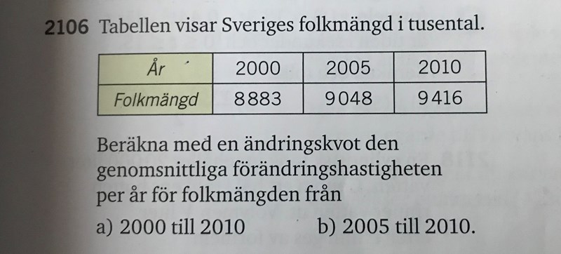 Det ska vara 73 600. År 2005 är folkmängden 9048000, fem år senare, 2010, så är folkmängden 9416000. Alltså har det på fem år skett en ökning på 368000 personer. Det betyder att om du ska ta reda på en genomsnittlig ökning varje år, som alltså ska vara lika varje år, så gör du: som är 73 600.