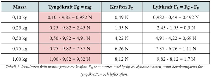 Eftersom vi inte kunda använda beräkningar om volymen för den undanträngda vätskan har jag istället använt sambandet FL = Fg - Fd (där Fd är den kraften som visas på dynamometern) då jag tar ut differensen mellan tyngdkraften i lyft och tyngdkraften i vatten.