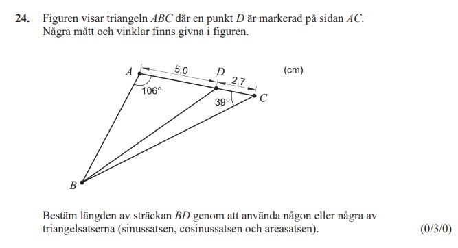 BD= 2,72 * 12,92 - 2 * 2,7 * 12,9 * cos 39 ger att BD = 34 cm. Rätt svar är runt 10 cm