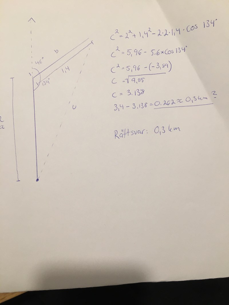 Så här tänkte jag: När jag ritar ut detta så får jag en triangel där ena sidan är 2 och andra 1,4 samt vinkeln 46 grader. Utifrån det använder jag cosinussatsen: .