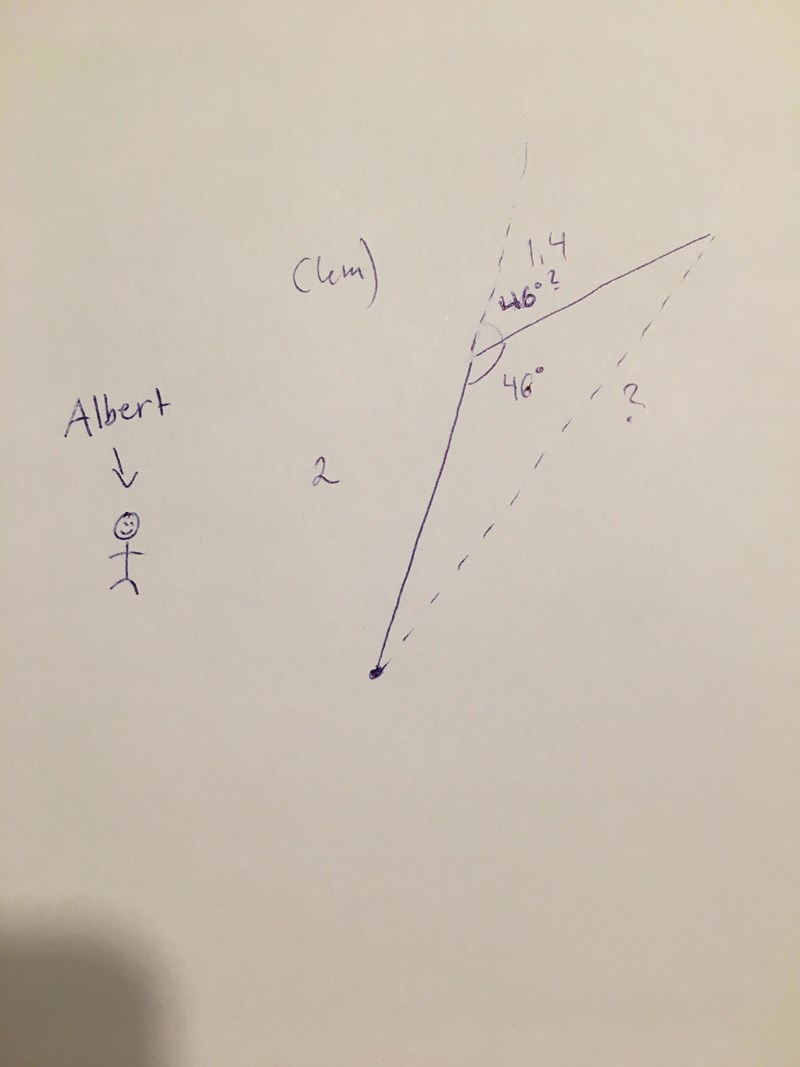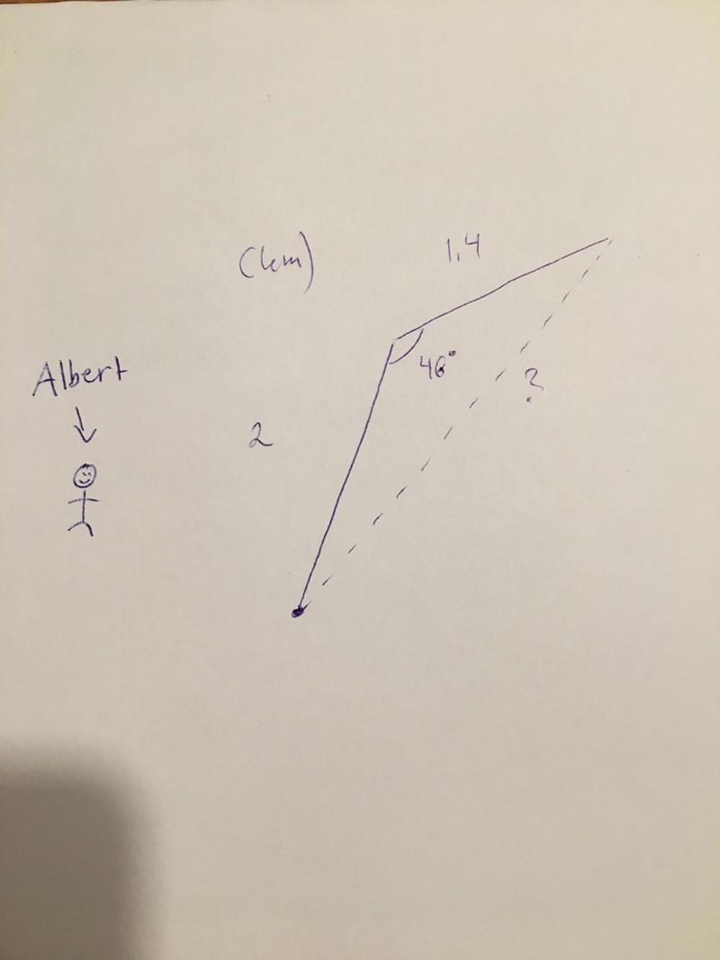 "Albert går 2 km utefter en rak väg. Därefter vrider sig vägen 46 grader. Albert fortsätter i den nya riktningen i 1,4km rakt framåt. På hemvägen tar han en genväg rakt mot utgångspunkten. Hur mycket kortare blev hans väg tillbaka?