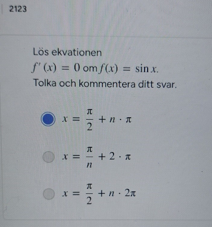 Oh dumma mig, jag förstår vad du menar. Men rätta svarsalternativet visar perioden pi dvs 180 grader, men cos x = 0 upprepas för varje nytt varv dvs 2pi va?