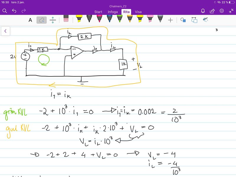 Hej jag har en uppgift som jag försökt lösa men får fel tecken på i(k) som istället ska vara -2mA. Jag har ritat upp kretsen nedan. Men alla mina andra värden värkar vara korrekta.