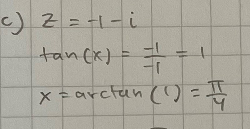Problemet här är att arctan ensam inte räcker. 1+i har argumentet pi/4, -1-i har argumentet 5pi/4 (eller kanske -3pi/4, jag är osäker på definitionen).