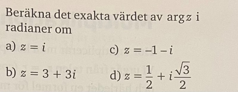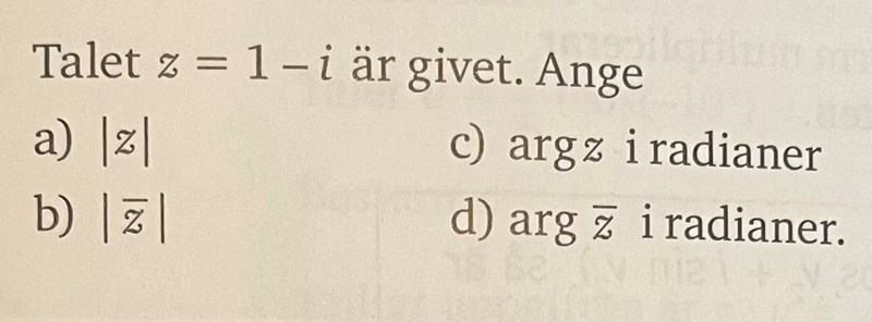 Laguna skrev:Problemet här är att arctan ensam inte räcker. 1+i har argumentet pi/4, -1-i har argumentet 5pi/4 (eller kanske -3pi/4, jag är osäker på definitionen).