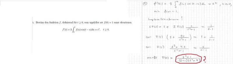 Håller på att lösa problemet i nedanstående bild och får inte ut samma uttryck för F(s) som de i lösningen får, vilket gör att jag fastnat helt. Jag misstänker att det handlar om något trivialt som jag gjort fel på, någon form av division/multiplikation som jag fått till fel. Uppskattar ifall någon kan förklara vart det gick snett för mig; tack på förhand!