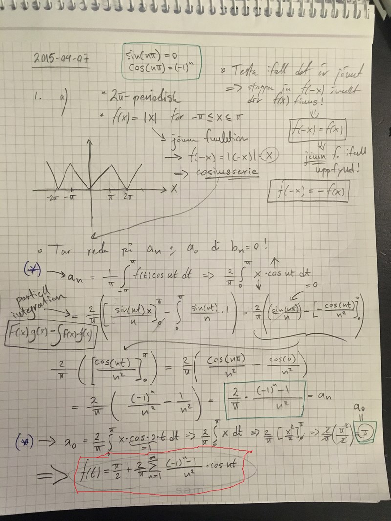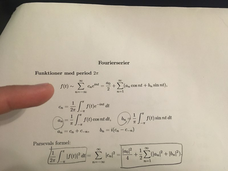 Det jag markerar med fingret är själva formeln jag utgår ifrån när jag skapar min fourierserie för uttrycket ifråga.