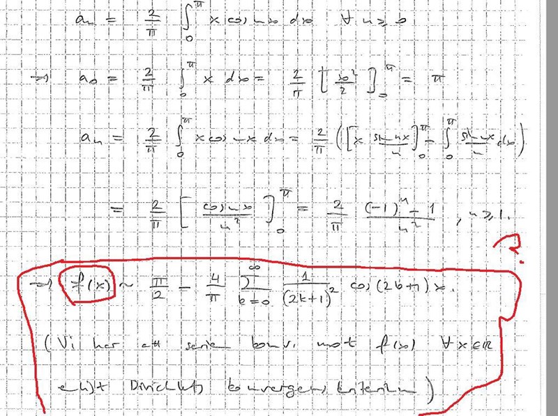 Kommer nästan hela vägen till mållinjen när jag ska ta fram fourierserien till en funktion på trigonometrisk form (se bild nedan för mina beräkningar). Men där det tar stopp är alldeles på slutet när jag ska sätta samman mitt a_0 och a_n. Varför får de ett annat svar än mig? Jag begriper mig varken på vad min lärare skrivit i lösningen eller varför de får det de får. Tänkte det kanske var en omskrivning av vad jag redan räknat fram, men misslyckas se något.