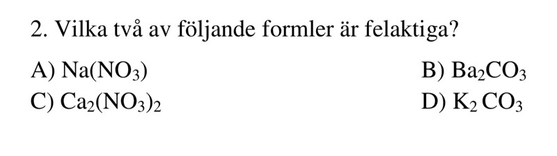 Jag skrev också att du behäver lära dig laddningen för nitratjon respektive karbonatjon utantill, och gav dig ett sätt att underlätta inlärningen eftersom du fick något att hänga upp kunskapen på. Formlerna för salpetersyra HNO3 pch kolsyra H2CO3 kan du förhoppningsvis redan.