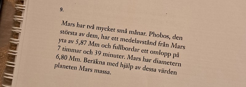 Du ska försöka hitta avståndet mellan centrum av planeten och Phobos. Phobos är så liten att du kan försumma dess diameter. Men du måste ta hänsyn till Mars radie. Lägg alltså ihop Mars radie + avståndet mellan ytan Mars och Phobos