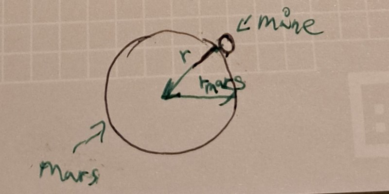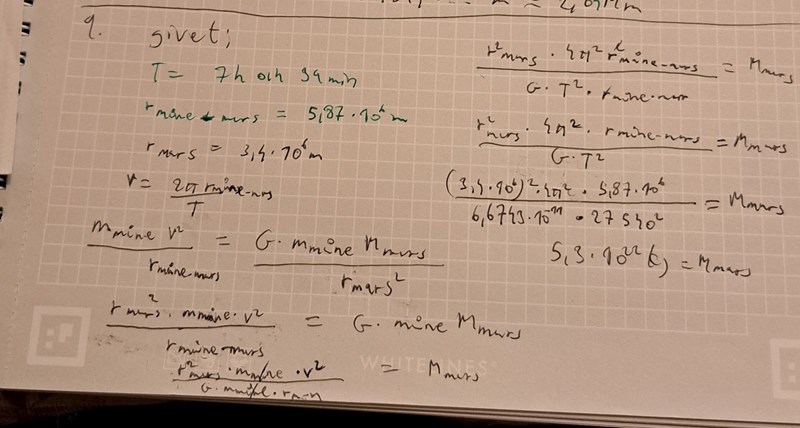 Yta är väl att månen sitter där jag ritade. Vi ser att mars har en diameter som är givet från givet från uppgiften dvs d/2=radie för mars. Månen har ett avstånd från ytan den står på till mars masscentrum.