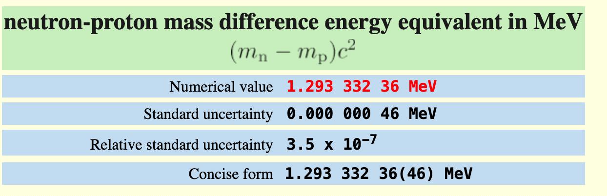 Just det. Jag fick fram procentsatsen. Så masskillnaden på 2,306×10^-30 kg är cirka 0,14 procent av 931,49 MeV och då landar man på 1,293 MeV. Precis det värde du länkade.