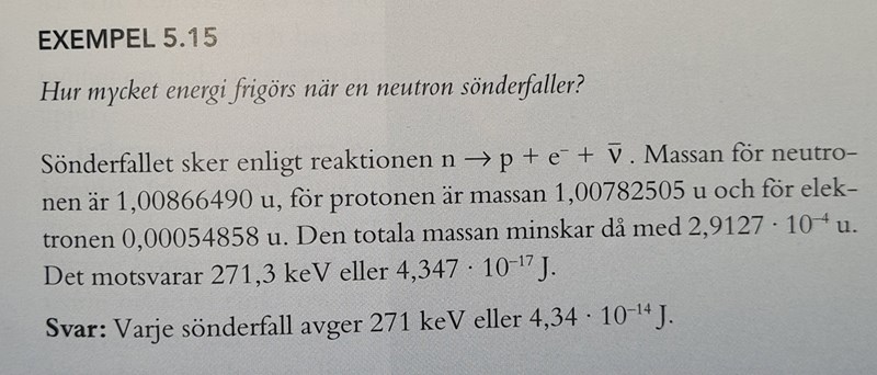 Exemplet säger att energi som frigörs vid neutronsönderfall är 271 keV eller 4,34×10^-14 J.