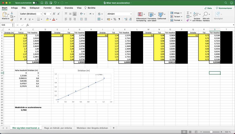 Tack för hjälpen, tyvärr vet jag inte lutningen på bordet för jag använde böcker för att höja bordet. Läraren har inte sagt något om lutning, däremot sa han att lutningen ska vara lagom- bilen ska inte accelerera för fort eller för långsamt. Och Excel-filen fick jag av läraren, han skapade den för att hjälpa elever att få fram ett diagram.
