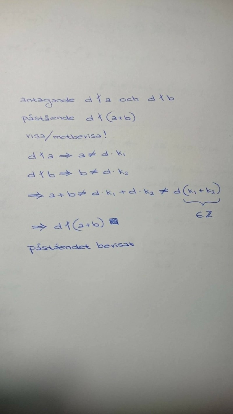 Påstående. Låt a, b och d vara heltal, och anta att d ł a och d ł b. Då gäller även d ł (a+b).