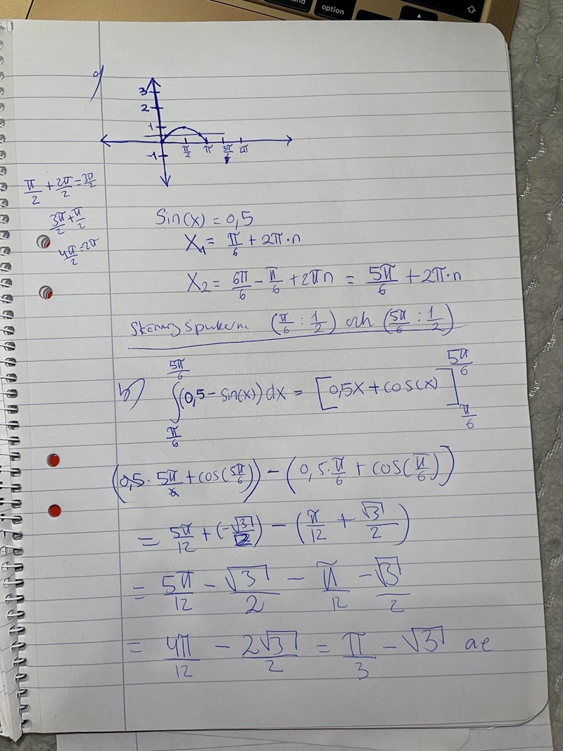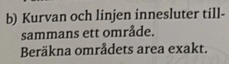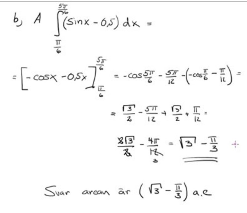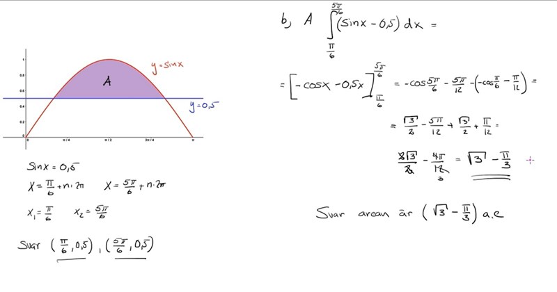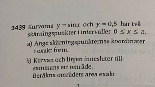Det står att "Kurvan (y = sin(x)) och linjen (y = 0,5) innesluter tillsammans ett område. (i intervallet 0 x )