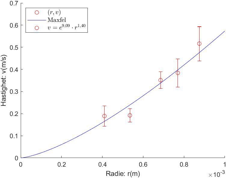 1: Vet inte riktigt hur jag ska använda max/min för att få fram maxfelet för hastigheten dock. Mätvärderna har vi fått fram experimentellt och efter linjarisering har vi fått fram ett uttryck som uppskattar hastighetens beroende av radien men innan dess har vi inget beroende. Hur maxfelet av volymen och tiden påverkar maxfelet av hastigheten är uppenbart i exemplet från föreläsningen. Men för att ta reda på hur maxfelet av r påverkar maxfelet av hastigheten måste vi först känna till hur de beror av varandra. Detta är alltså egentligen en liten petitess. Föreläsningsexemplet ger att maxfelet av radien kommer påverka hastighetens maxfel enligt Dr/r0 multiplicerat med "derivatan" av dessa (som kanske kan avrundas upp till två) där Dr är maxfelet för radien. Problemet är ju att vi rent tekniskt sätt inte har en konkret derivata och eftersom vi inte har ett uttryck för hur hastigheten beror av radien. Uttrycket vi tagit fram av mätvärderna kan ju eventuellt påverkas av mätosäkerheten av radien så det blir lite konstigt att använda detta uttryck för att uppskatta hur maxfelet av radien påverkar maxfelet för hastigheten. Det blir lite av ett cirkelresonemang där mätosäkerheten av radien i verkligheten kan komma att påverka uttrycket som tagits fram som i felfortplantningsformeln användes för att ta fram hur maxfelet av radien påverkar maxfelet av hastigheten som kan påverka uttrycket som tagits fram etc.