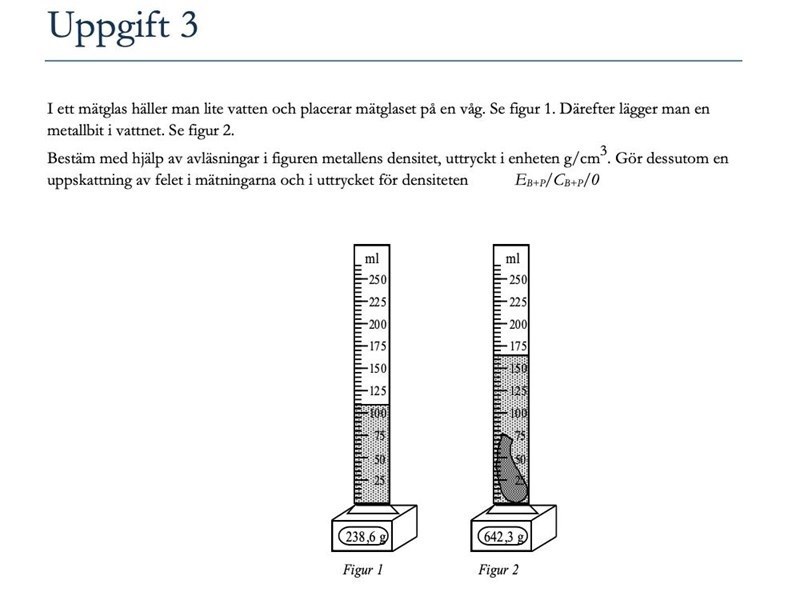 Bestäm med hjälp av avläsningar i figuren metallens densitet, uttryckt i enheten g/cm3. Gör dessutom en