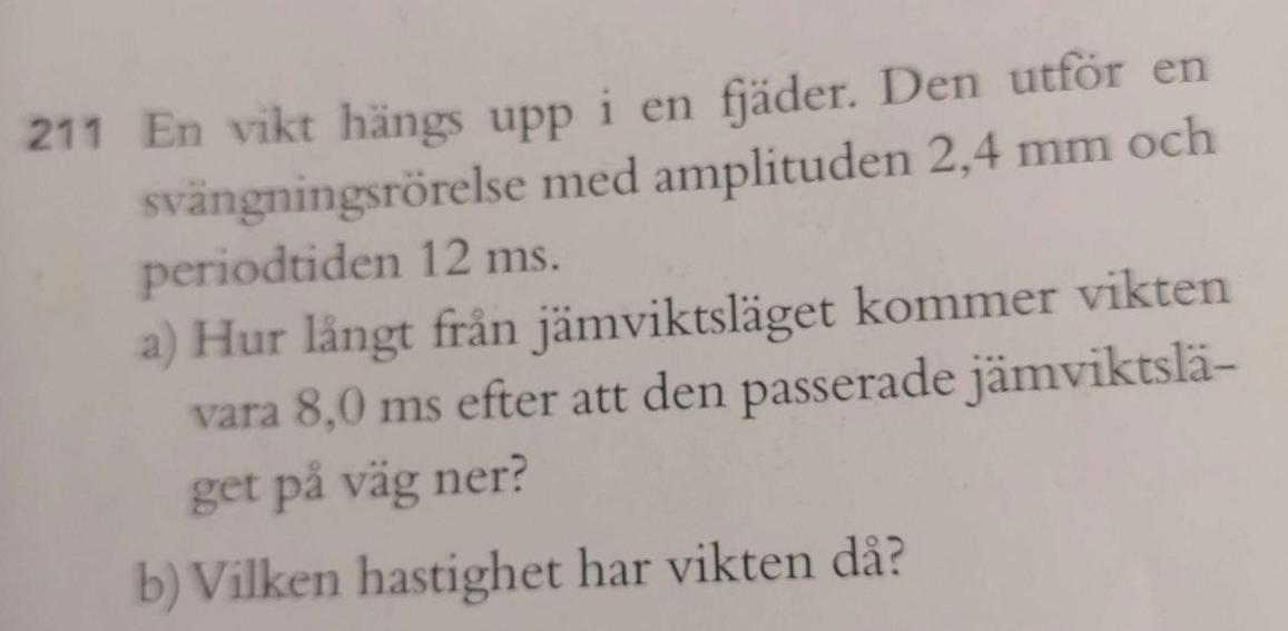 På a) så vet jag att jag kan få ut y (elongation) genom formeln y=Asin(wt) från formelblad, och jag får A = 2,4mm och T = 12ms. Då kan jag lösa ut a uppgiften.
