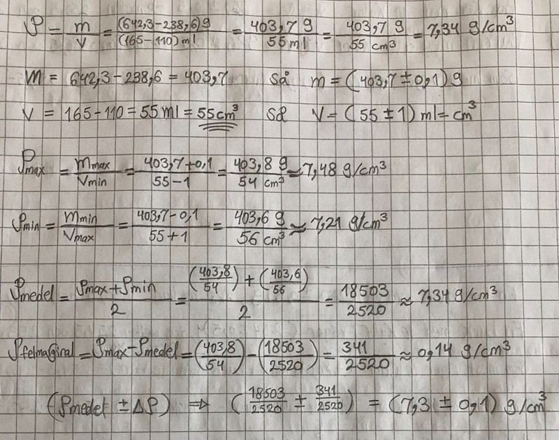 Det är väl ungefär allt. Visst, ett svar måste formuleras: densiteten är ϱ = 7,3 ± 0,2 g/cm3.