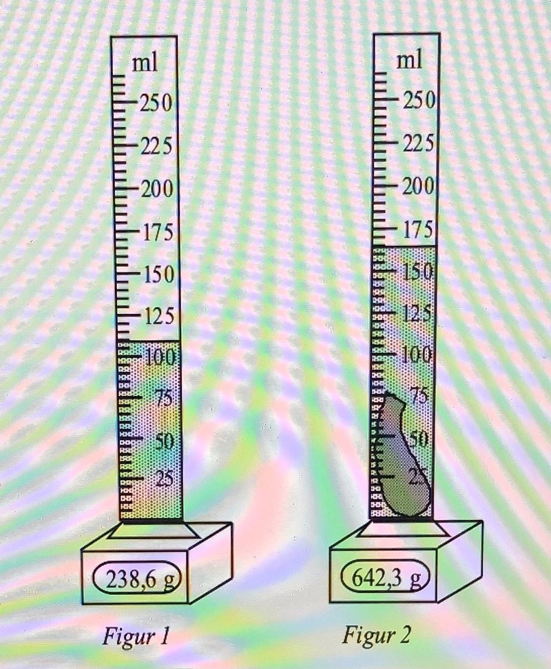 I ett mätglas häller man ut lite vatten och placerar mätglaset på en våg, se figur 1. Därefter lägger man en metallbit i vattnet, se figur 2. Bestäm med hjälp av avläsningar i figuren metallens densitet, uttryckt i enheten g/cm3. Gör dessutom en uppskattning av felet i märkningarna och i uttrycket för densiteten..