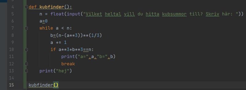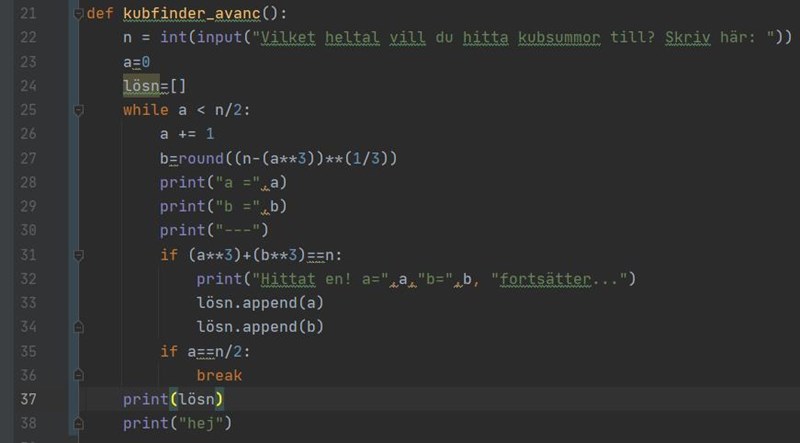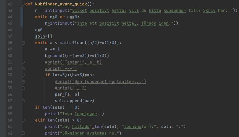 Funktionen kubfinder_avanc_quick() kan utökas med argument, t ex kubfinder_avanc_quick(n). Då kan funktionen anropas med det heltal man vill hitta kubsummor till. Låt sedan funktionen slutligen returnera lösningen. Ändra i funktionen så här och spara som exvis kubfinder.py: